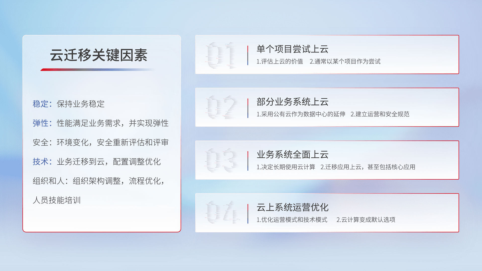 结合实际业务,,,,从规划设计、、云平台选型、、、、云原生改造、、、、数据迁移、、、、集成交付,,,,迁移全过程为客户识别最佳上云路径,,,,做好风险识别管理,,设计网络架构、、身份权限、、、、安全审计合规、、、操作审计、、、日志审计、、、监控告警策略、、、多站点容灾设计等,,对云上基础设施进行整体规划,,,,提升IT治理水平,,,以满足弹性、、高可用、、、、高性能的需求。。。