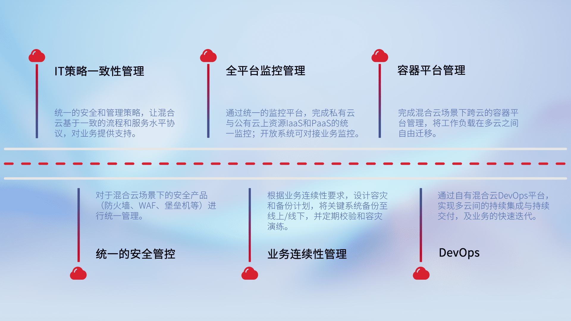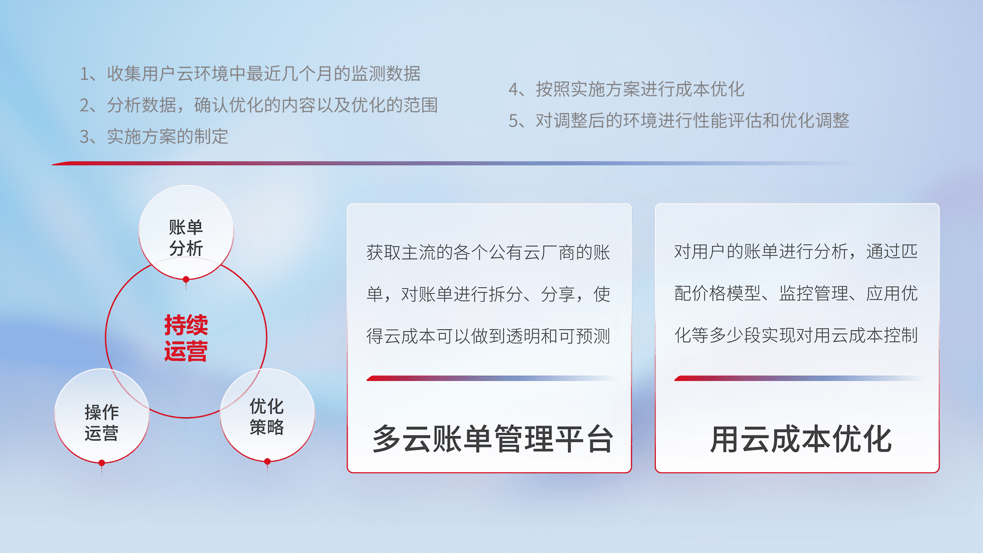 通过多云纳管,,,以统一的资源数据模型把客户的云资源进行抽象和封装,,,,进而实现对多云资源的统一操作,,保障云资源管理的可靠性、、、稳定性与可用性。。。量身定制化运维内容,,,,配置、、、开发运维、、、补丁管理、、、备份、、监控、、认证和访问管理、、、审计和日常巡检等,,,,保障在用云过程中的可靠度,,稳定度以及高可用率。。。。