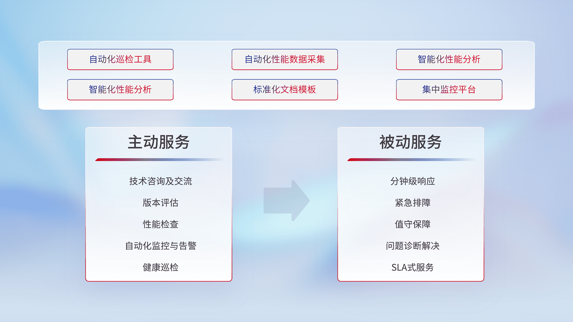 智能化工具和标准化文档,,保障服务质量,,,提供主动服务(包含技术咨询、、版本评估、、、性能检查、、、、自动化监控与告警、、健康巡检)和被动服务包含(分钟级响应、、、紧急排障、、、、值守保障、、、、问题诊断解决、、、、SLA服务)。。。
